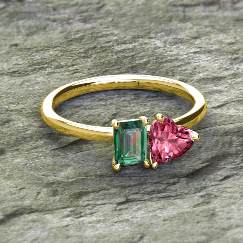 Simple and beautiful, this enchanting 2 Stone Duo Ring flaunting an Emerald Shape Lab Created Alexandrite dazzling along with Heart Shape Pink Tourmaline are perfect for the women who have a modern outlook and are willing to be unique.
