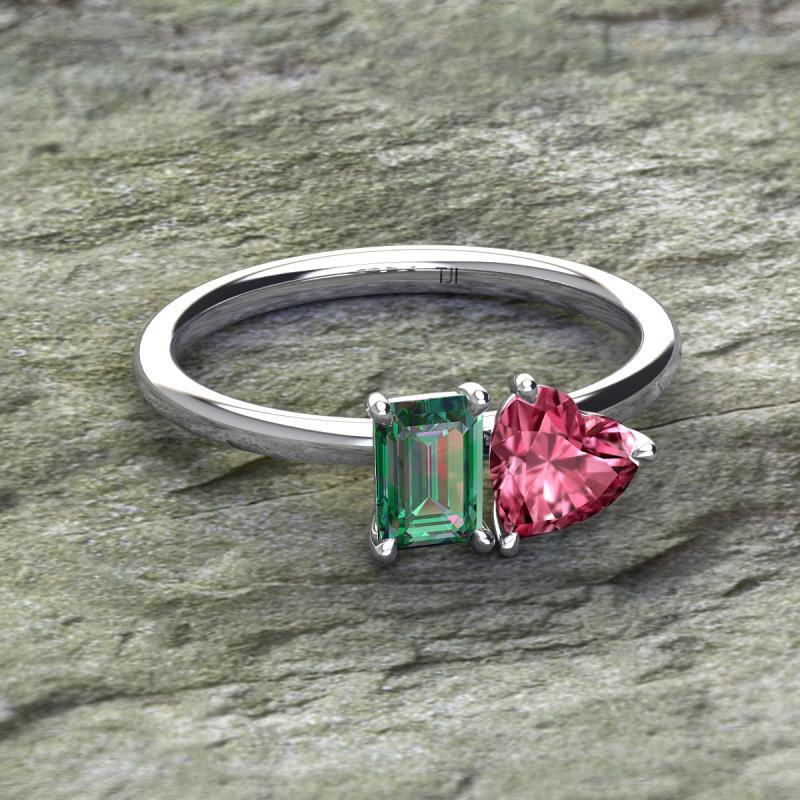 Simple and beautiful, this enchanting 2 Stone Duo Ring flaunting an Emerald Shape Lab Created Alexandrite dazzling along with Heart Shape Pink Tourmaline are perfect for the women who have a modern outlook and are willing to be unique.
