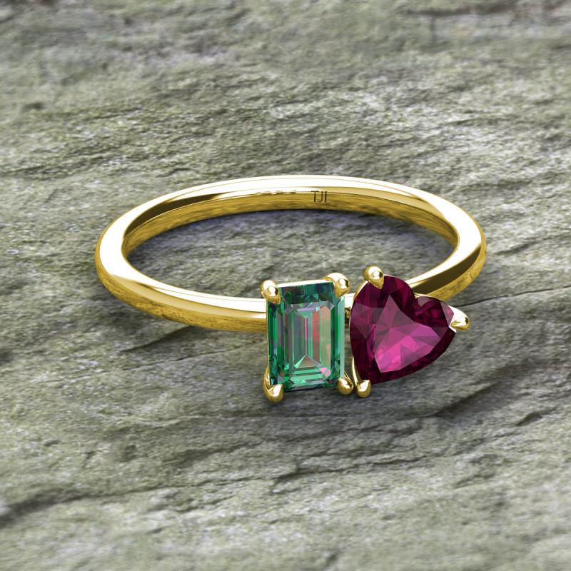 Simple and beautiful, this enchanting 2 Stone Duo Ring flaunting an Emerald Shape Lab Created Alexandrite dazzling along with Heart Shape Rhodolite Garnet are perfect for the women who have a modern outlook and are willing to be unique.