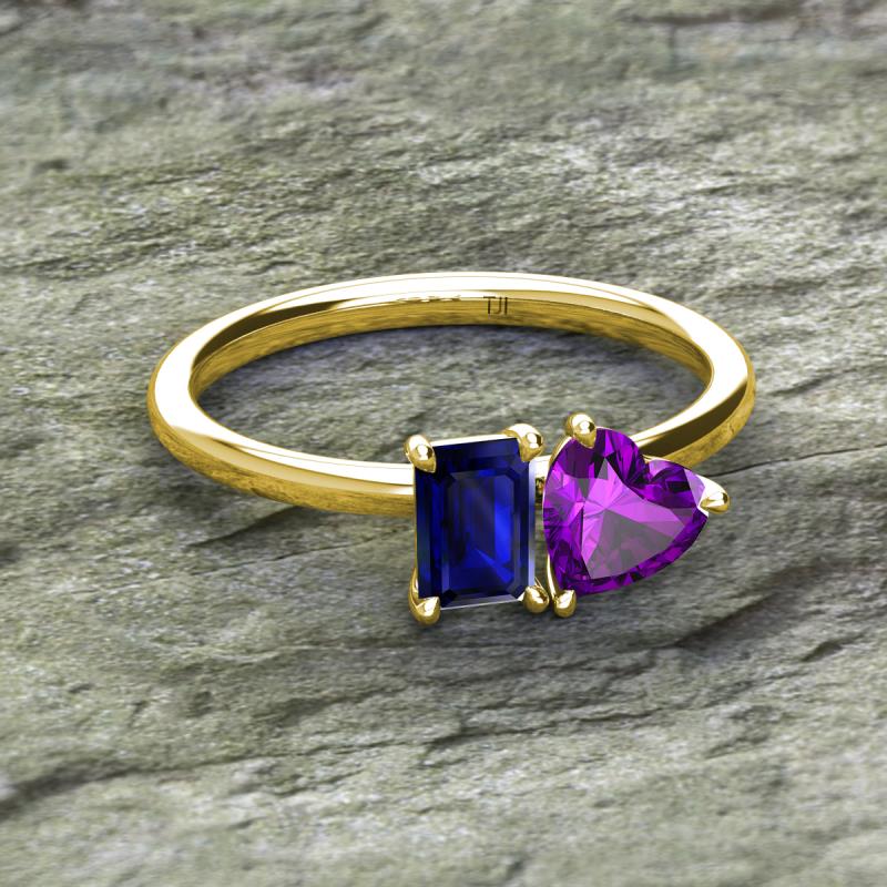 Simple and beautiful, this enchanting 2 Stone Duo Ring flaunting an Emerald Shape Lab Created Blue Sapphire dazzling along with Heart Shape Amethyst are perfect for the women who have a modern outlook and are willing to be unique.
