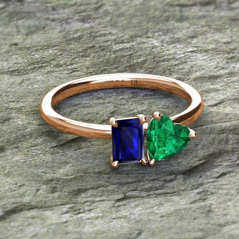 Simple and beautiful, this enchanting 2 Stone Duo Ring flaunting an Emerald Shape Lab Created Blue Sapphire dazzling along with Heart Shape Lab Created Emerald are perfect for the women who have a modern outlook and are willing to be unique.