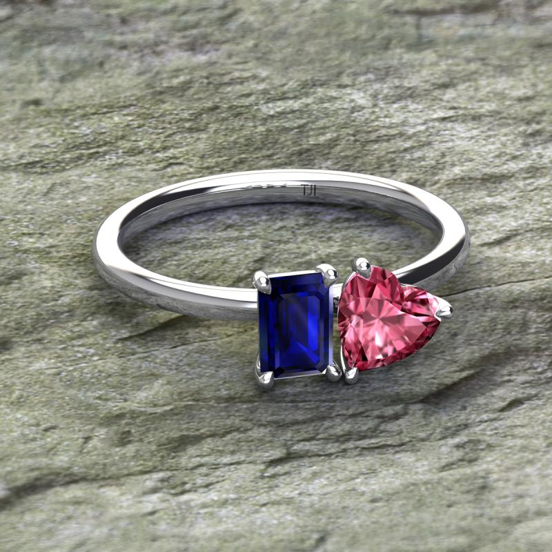 Simple and beautiful, this enchanting 2 Stone Duo Ring flaunting an Emerald Shape Lab Created Blue Sapphire dazzling along with Heart Shape Pink Tourmaline are perfect for the women who have a modern outlook and are willing to be unique.