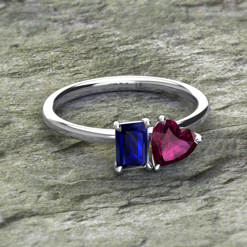 Simple and beautiful, this enchanting 2 Stone Duo Ring flaunting an Emerald Shape Lab Created Blue Sapphire dazzling along with Heart Shape Rhodolite Garnet are perfect for the women who have a modern outlook and are willing to be unique.