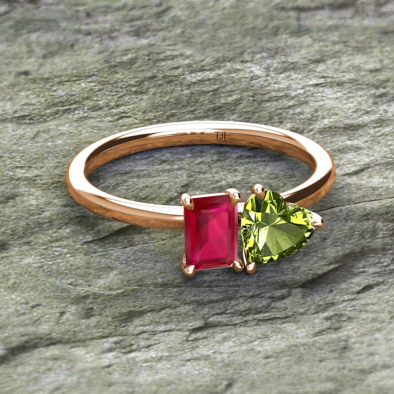 Simple and beautiful, this enchanting 2 Stone Duo Ring flaunting an Emerald Shape Lab Created Ruby dazzling along with Heart Shape Peridot are perfect for the women who have a modern outlook and are willing to be unique.