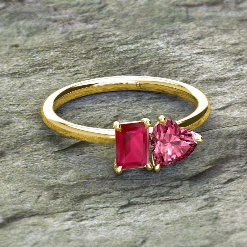 Simple and beautiful, this enchanting 2 Stone Duo Ring flaunting an Emerald Shape Lab Created Ruby dazzling along with Heart Shape Pink Tourmaline are perfect for the women who have a modern outlook and are willing to be unique.