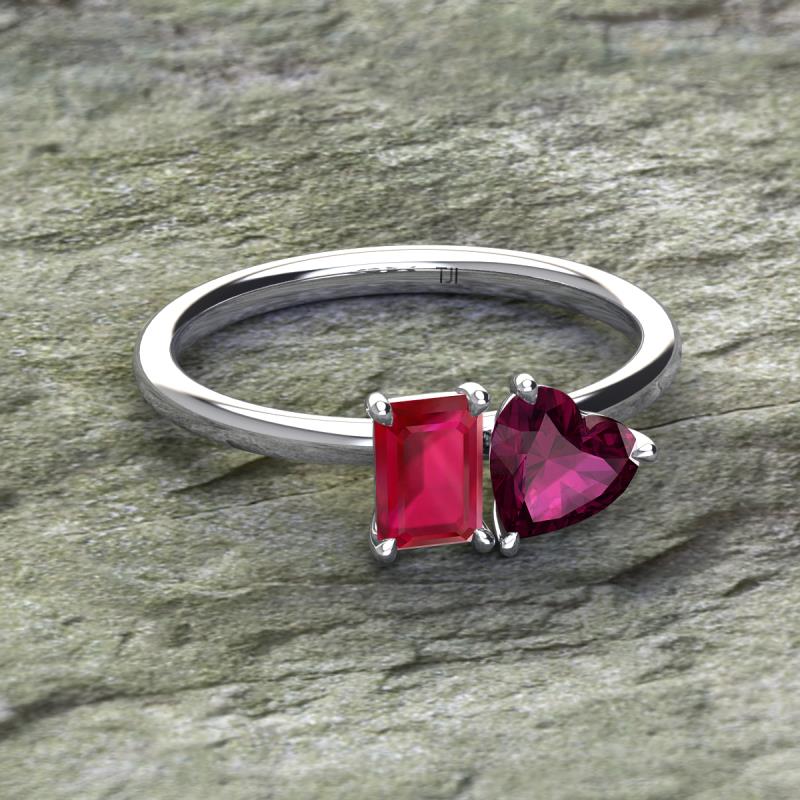 Simple and beautiful, this enchanting 2 Stone Duo Ring flaunting an Emerald Shape Lab Created Ruby dazzling along with Heart Shape Rhodolite Garnet are perfect for the women who have a modern outlook and are willing to be unique.