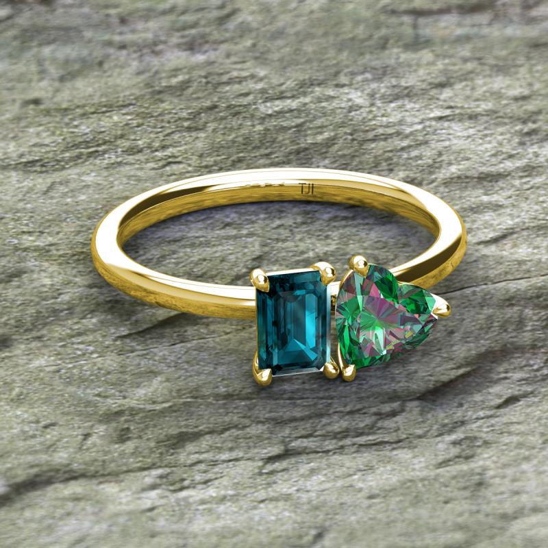 Simple and beautiful, this enchanting 2 Stone Duo Ring flaunting an Emerald Shape London Blue Topaz dazzling along with Heart Shape Lab Created Alexandrite are perfect for the women who have a modern outlook and are willing to be unique.