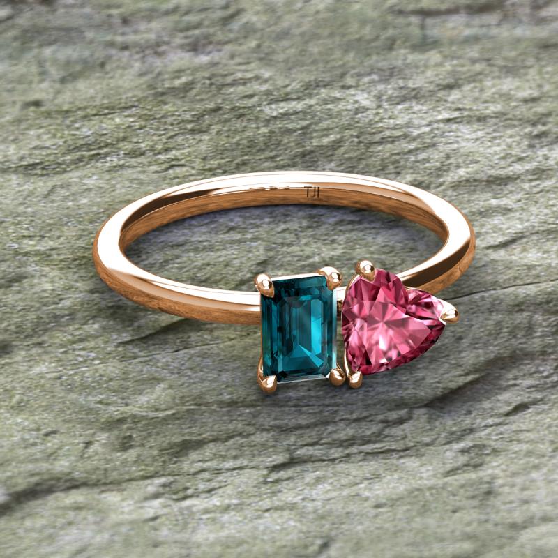 Simple and beautiful, this enchanting 2 Stone Duo Ring flaunting an Emerald Shape London Blue Topaz dazzling along with Heart Shape Pink Tourmaline are perfect for the women who have a modern outlook and are willing to be unique.