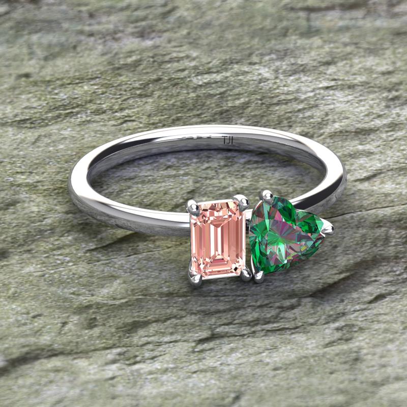 Simple and beautiful, this enchanting 2 Stone Duo Ring flaunting an Emerald Shape Morganite dazzling along with Heart Shape Lab Created Alexandrite are perfect for the women who have a modern outlook and are willing to be unique.