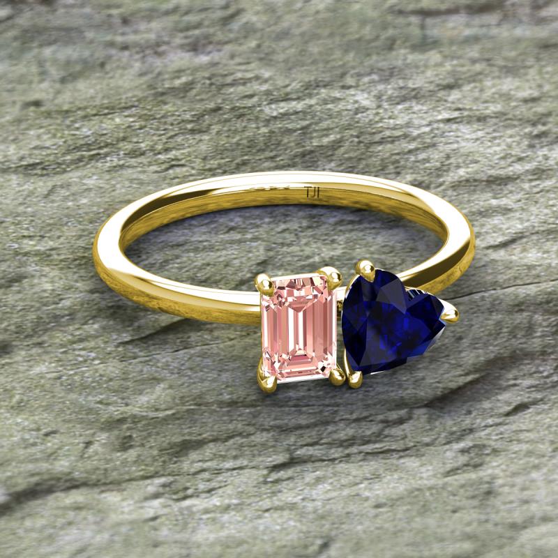 Simple and beautiful, this enchanting 2 Stone Duo Ring flaunting an Emerald Shape Morganite dazzling along with Heart Shape Lab Created Blue Sapphire are perfect for the women who have a modern outlook and are willing to be unique.