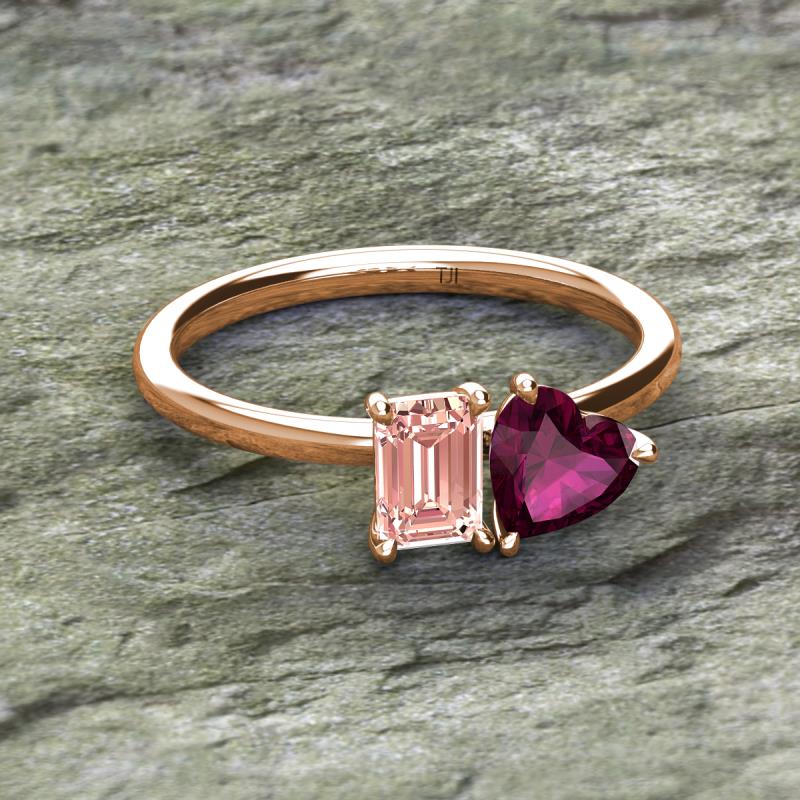 Simple and beautiful, this enchanting 2 Stone Duo Ring flaunting an Emerald Shape Morganite dazzling along with Heart Shape Rhodolite Garnet are perfect for the women who have a modern outlook and are willing to be unique.