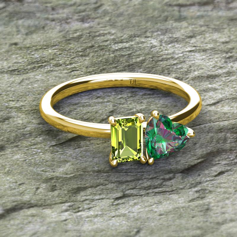 Simple and beautiful, this enchanting 2 Stone Duo Ring flaunting an Emerald Shape Peridot dazzling along with Heart Shape Lab Created Alexandrite are perfect for the women who have a modern outlook and are willing to be unique.
