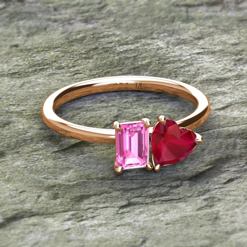 Simple and beautiful, this enchanting 2 Stone Duo Ring flaunting an Emerald Shape Pink Sapphire dazzling along with Heart Shape Lab Created Ruby are perfect for the women who have a modern outlook and are willing to be unique.