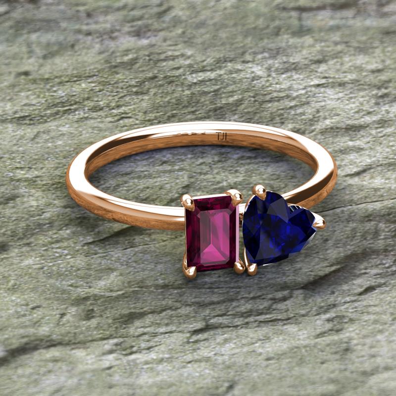 Simple and beautiful, this enchanting 2 Stone Duo Ring flaunting an Emerald Shape Rhodolite Garnet dazzling along with Heart Shape Lab Created Blue Sapphire are perfect for the women who have a modern outlook and are willing to be unique.