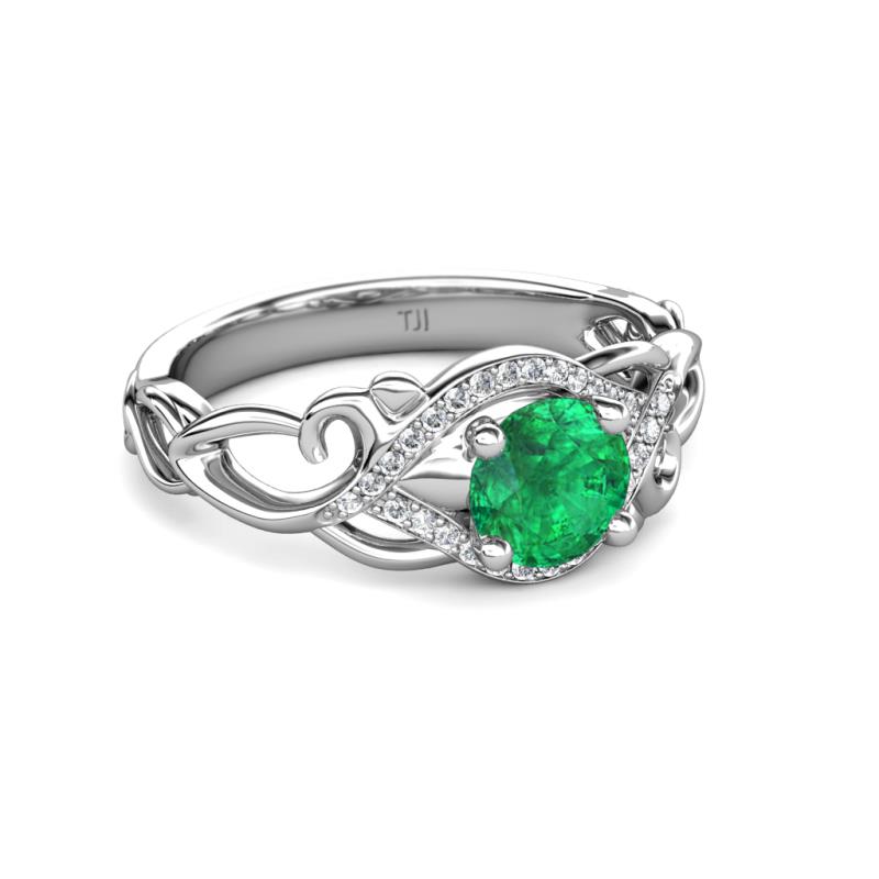 Celebrity style, this spectacular Engagement Ring has Center Emerald wrapped by arc head of pave set Diamonds with open crossover swirl designer shank making it perfect to honor the one you love.