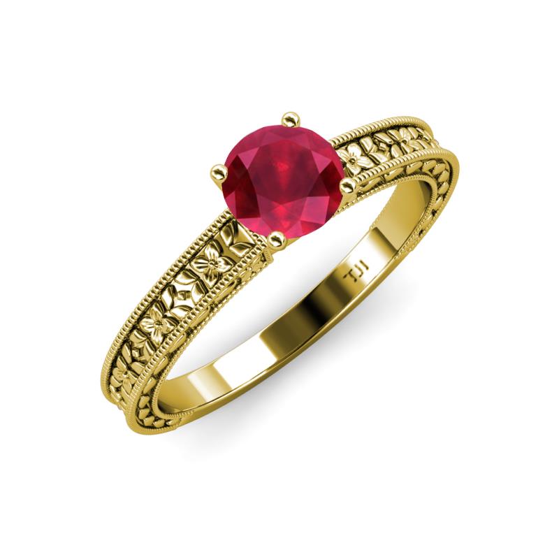 Round (6.00 mm) Ruby 0.95 ct Floral Engraved Milgrain Womens Solitaire Engagement Ring 14K Yellow Gold More Details ...