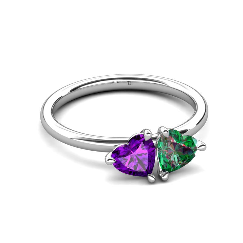 Celebrate your love with this stunning ring of 1.43 ctw features two heart-shaped Amethyst & Lab Created Alexandrite nestled together in a "toi et moi" design & the unique tiger claw prong setting adds a touch of edginess and modernity to the classic design symbolizing the unity and connection between two people in love & a perfect choice for the fashion-forward bride.