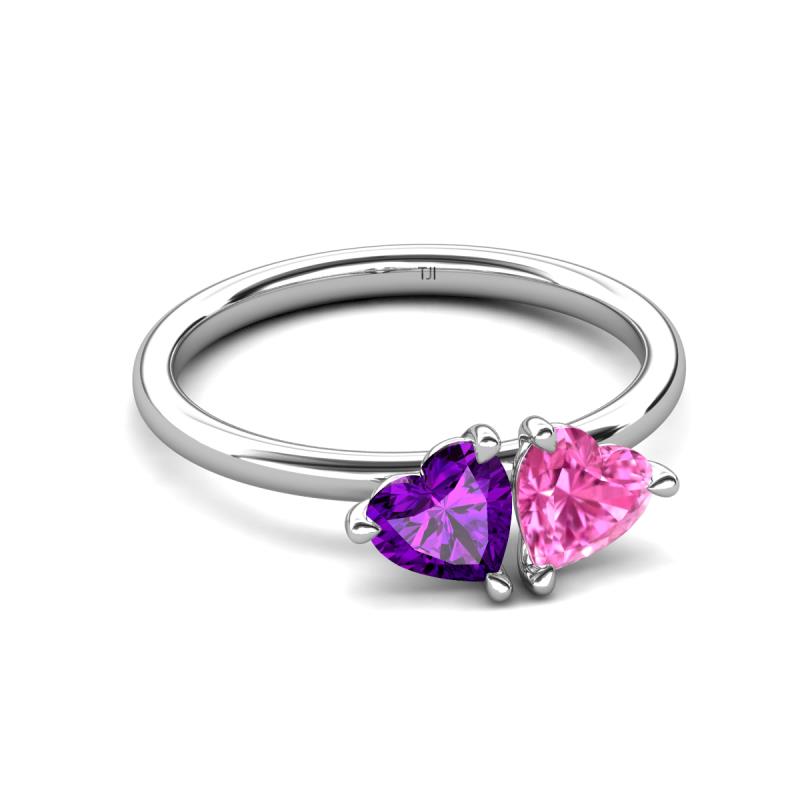 Celebrate your love with this stunning ring of 1.58 ctw features two heart-shaped Amethyst & Lab Created Pink Sapphire nestled together in a "toi et moi" design & the unique tiger claw prong setting adds a touch of edginess and modernity to the classic design symbolizing the unity and connection between two people in love & a perfect choice for the fashion-forward bride.