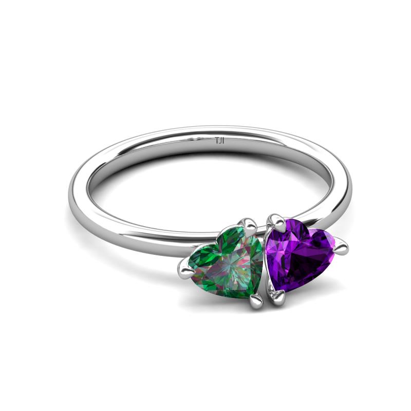 Celebrate your love with this stunning ring of 1.43 ctw features two heart-shaped Lab Created Alexandrite & Amethyst nestled together in a "toi et moi" design & the unique tiger claw prong setting adds a touch of edginess and modernity to the classic design symbolizing the unity and connection between two people in love & a perfect choice for the fashion-forward bride.