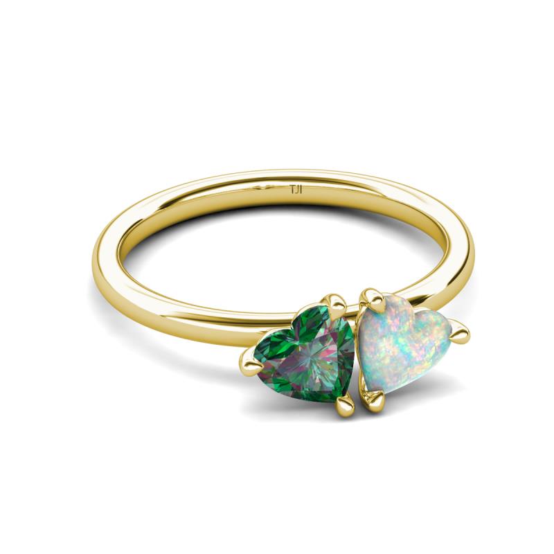 • 1 Lab Created Alexandrite Heart Shape 0.75 ctw/6.00 mm & 1 Opal Heart Shape 0.45 ctw/6.00 mm Two Stone Duo Engagement Ring set in a Tiger Claw Prong Setting.