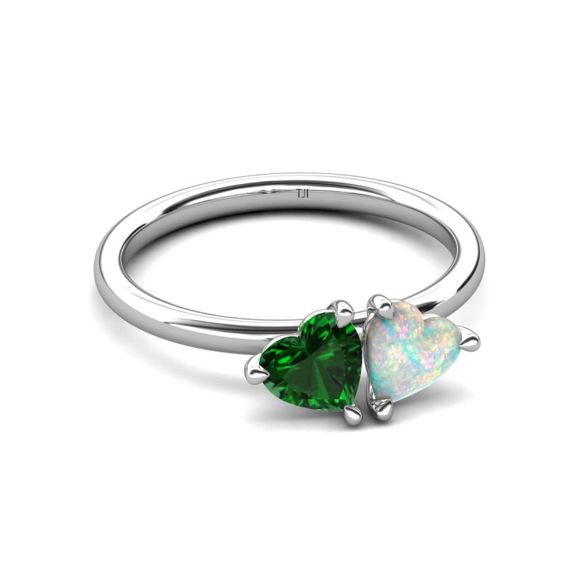 Celebrate your love with this stunning ring of 1.20 ctw features two heart-shaped Lab Created Emerald & Opal nestled together in a "toi et moi" design & the unique tiger claw prong setting adds a touch of edginess and modernity to the classic design symbolizing the unity and connection between two people in love & a perfect choice for the fashion-forward bride.