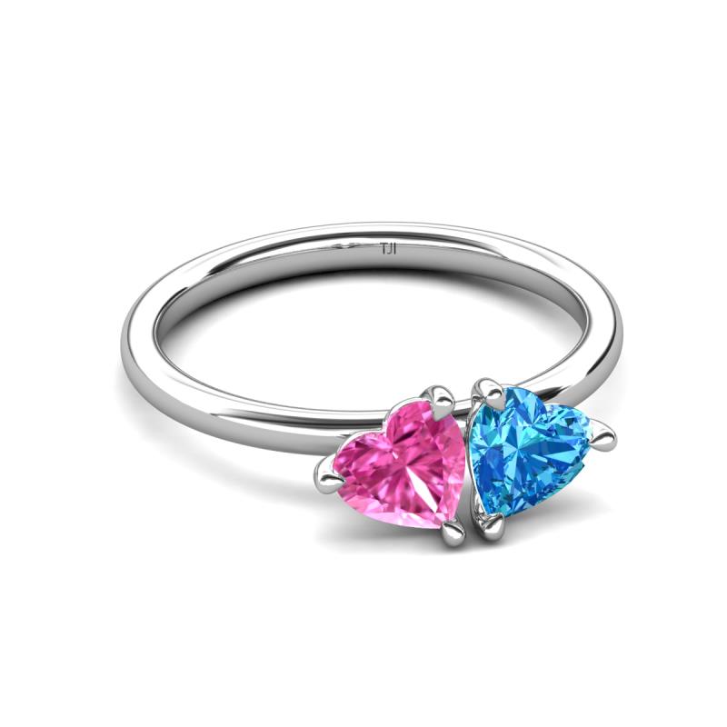 • 1 Lab Created Pink Sapphire Heart Shape 0.90 ctw/6.00 mm & 1 Blue Topaz Heart Shape 1.00 ctw/6.00 mm Two Stone Duo Engagement Ring set in a Tiger Claw Prong Setting.