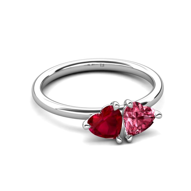 • 1 Lab Created Ruby Heart Shape 0.80 ctw/6.00 mm & 1 Pink Tourmaline Heart Shape 0.80 ctw/6.00 mm Two Stone Duo Engagement Ring set in a Tiger Claw Prong Setting.