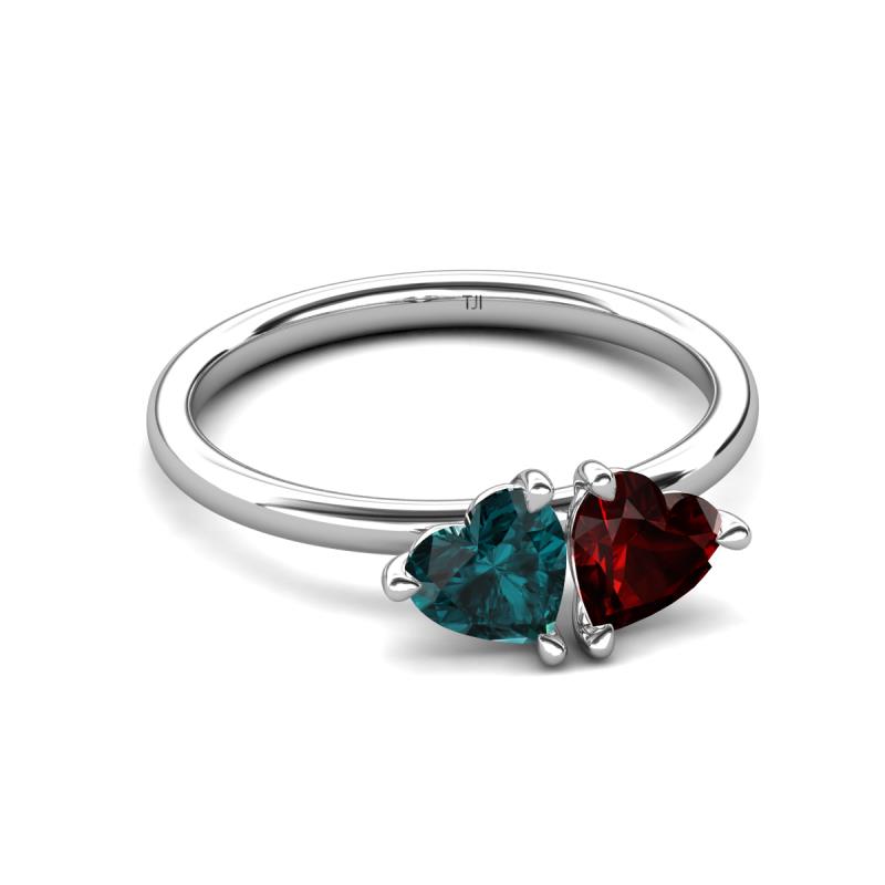 • 1 London Blue Topaz Heart Shape 1.00 ctw/6.00 mm & 1 Red Garnet Heart Shape 0.95 ctw/6.00 mm Two Stone Duo Engagement Ring set in a Tiger Claw Prong Setting.