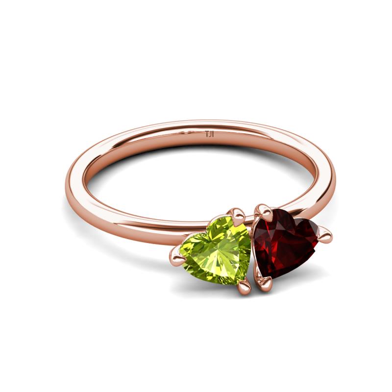 • 1 Peridot Heart Shape 0.95 ctw/6.00 mm & 1 Red Garnet Heart Shape 0.95 ctw/6.00 mm Two Stone Duo Engagement Ring set in a Tiger Claw Prong Setting.