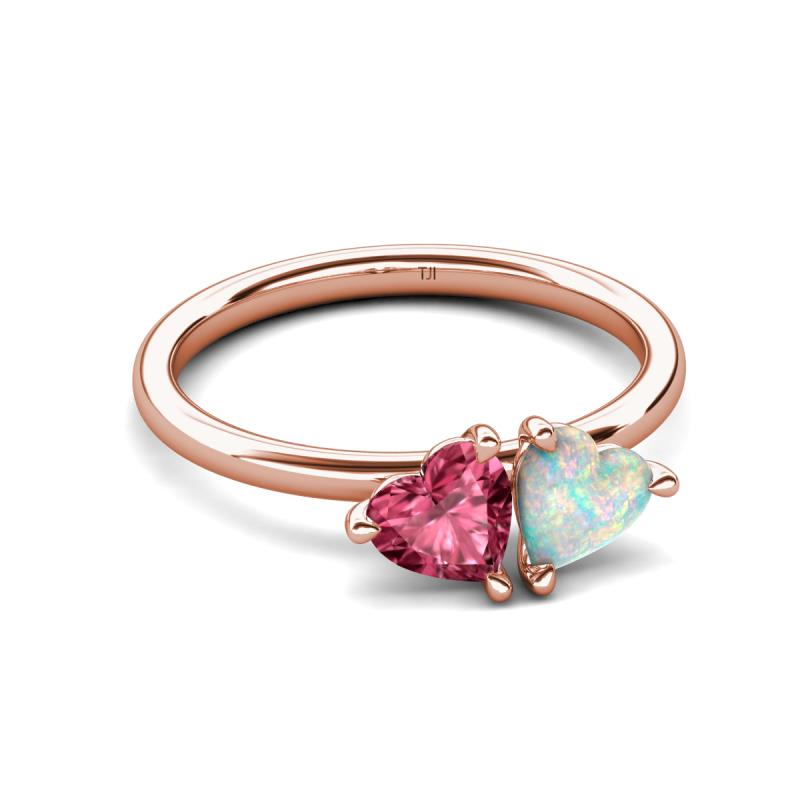 • 1 Pink Tourmaline Heart Shape 0.80 ctw/6.00 mm & 1 Opal Heart Shape 0.45 ctw/6.00 mm Two Stone Duo Engagement Ring set in a Tiger Claw Prong Setting.