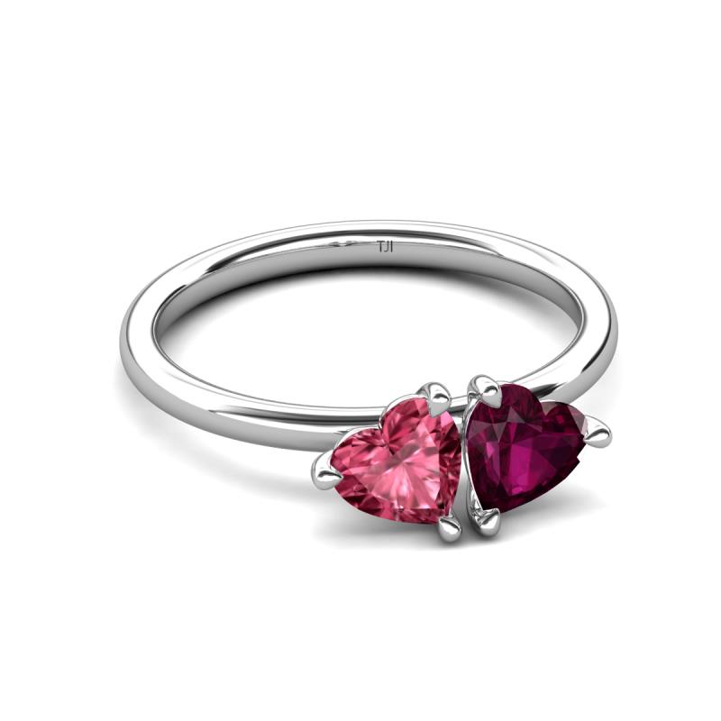 • 1 Pink Tourmaline Heart Shape 0.80 ctw/6.00 mm & 1 Rhodolite Garnet Heart Shape 1.10 ctw/6.00 mm Two Stone Duo Engagement Ring set in a Tiger Claw Prong Setting.