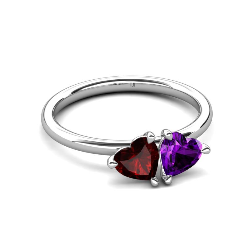 • 1 Red Garnet Heart Shape 0.95 ctw/6.00 mm & 1 Amethyst Heart Shape 0.68 ctw/6.00 mm Two Stone Duo Engagement Ring set in a Tiger Claw Prong Setting.