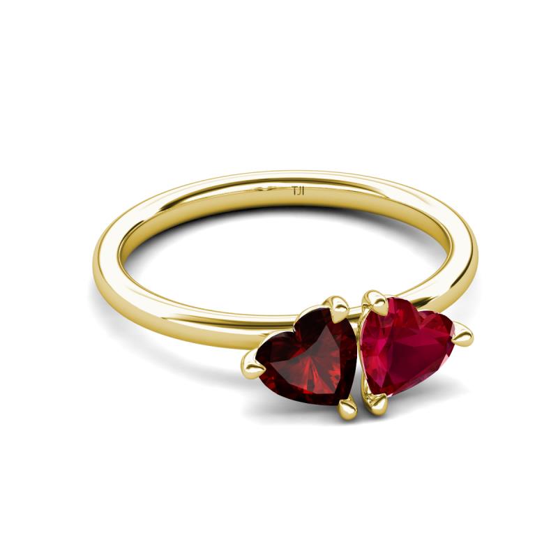 • 1 Red Garnet Heart Shape 0.95 ctw/6.00 mm & 1 Lab Created Ruby Heart Shape 0.80 ctw/6.00 mm Two Stone Duo Engagement Ring set in a Tiger Claw Prong Setting.