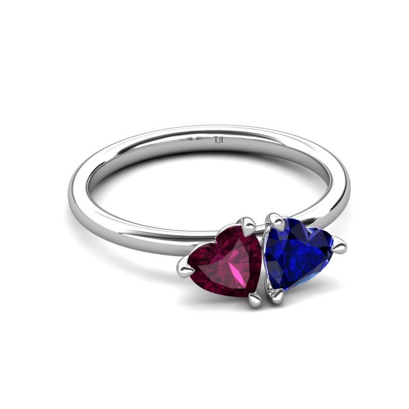 • 1 Rhodolite Garnet Heart Shape 1.10 ctw/6.00 mm & 1 Lab Created Blue Sapphire Heart Shape 0.90 ctw/6.00 mm Two Stone Duo Engagement Ring set in a Tiger Claw Prong Setting.