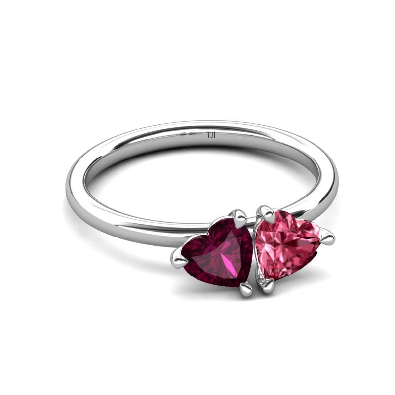• 1 Rhodolite Garnet Heart Shape 1.10 ctw/6.00 mm & 1 Pink Tourmaline Heart Shape 0.80 ctw/6.00 mm Two Stone Duo Engagement Ring set in a Tiger Claw Prong Setting.
