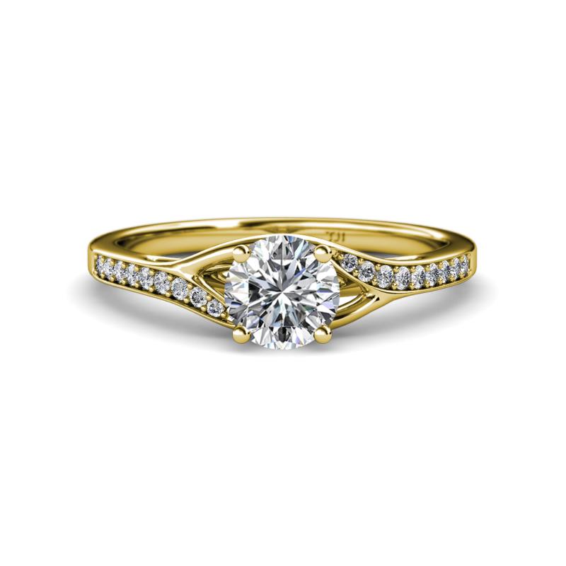 This Facinating Engagement Ring of 1.25 ctw has 4 Prong Set IGI Certified Round Center Lab Grown Diamond with crossover undergallery and single row graduated Pave Set Natural Diamonds bypass shank making it a wonderful addition to your Jewelry Collection.