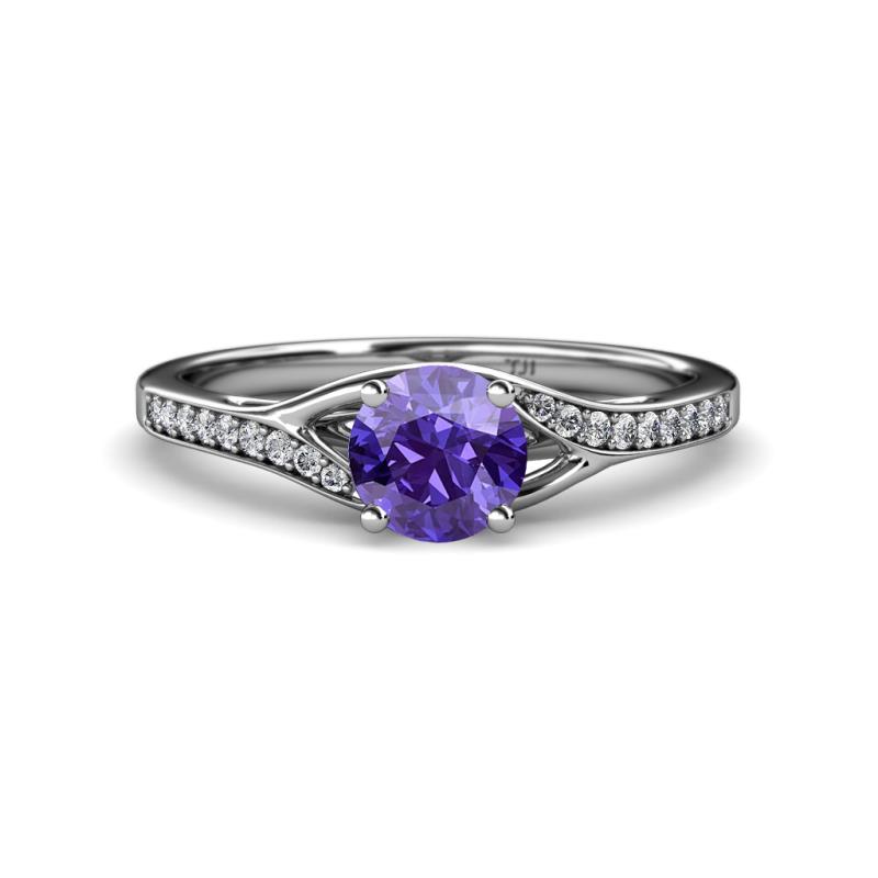 This Facinating Engagement Ring has 4 Prong Set Round Center Iolite with crossover undergallery and single row graduated Pave Set Diamonds bypass shank making it a wonderful addition to your Jewelry Collection.