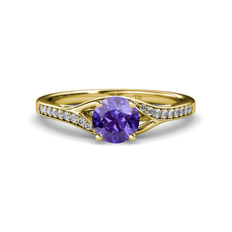 This Facinating Engagement Ring has 4 Prong Set Round Center Iolite with crossover undergallery and single row graduated Pave Set Diamonds bypass shank making it a wonderful addition to your Jewelry Collection.