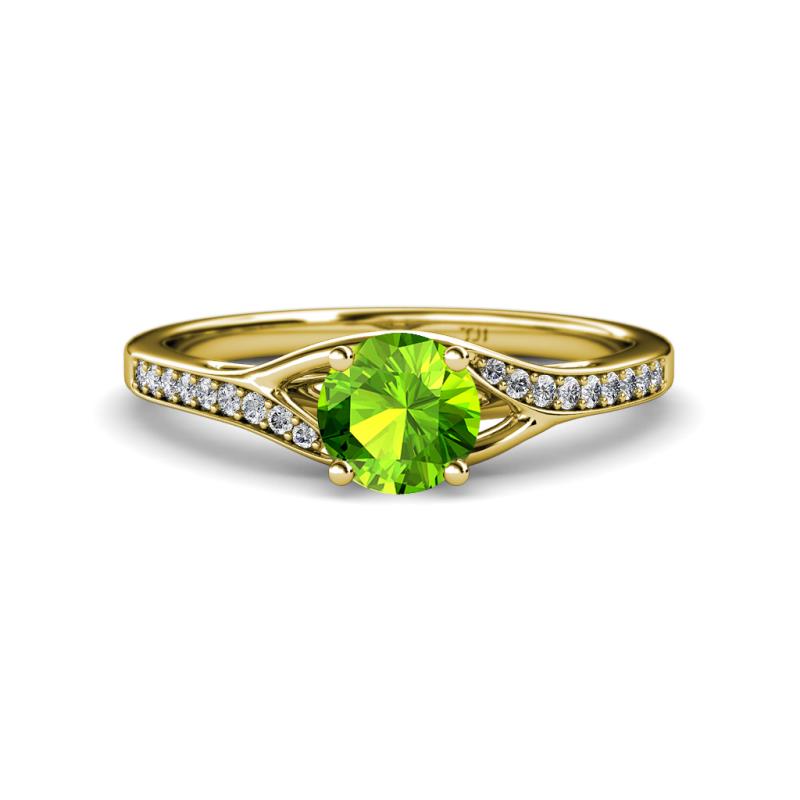 This Facinating Engagement Ring has 4 Prong Set Round Center Peridot with crossover undergallery and single row graduated Pave Set Diamonds bypass shank making it a wonderful addition to your Jewelry Collection.