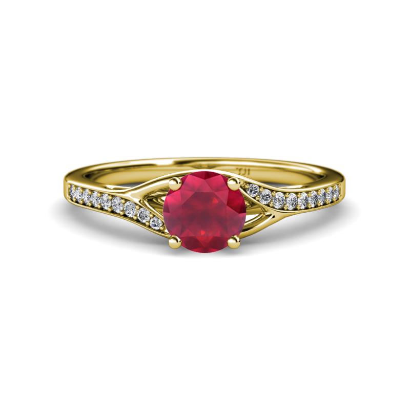 This Facinating Engagement Ring has 4 Prong Set Round Center Ruby with crossover undergallery and single row graduated Pave Set Diamonds bypass shank making it a wonderful addition to your Jewelry Collection.