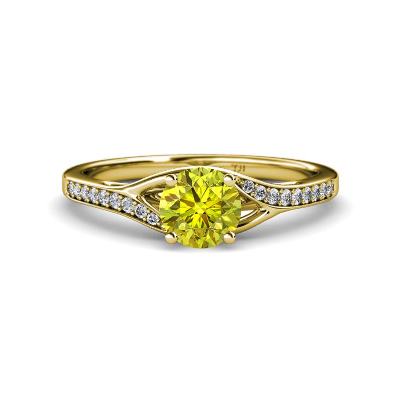 This Facinating Engagement Ring has 4 Prong Set Round Center Yellow Diamond with crossover undergallery and single row graduated Pave Set White Diamonds bypass shank making it a wonderful addition to your Jewelry Collection.
