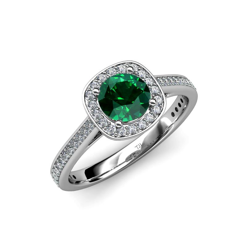 A Halo Cushion Frame of shimmering Round Diamonds surrounds the Center Emerald while additional Diamonds line the Ring's shank which gives a grace to the Ring making it a brilliant circle of Love.