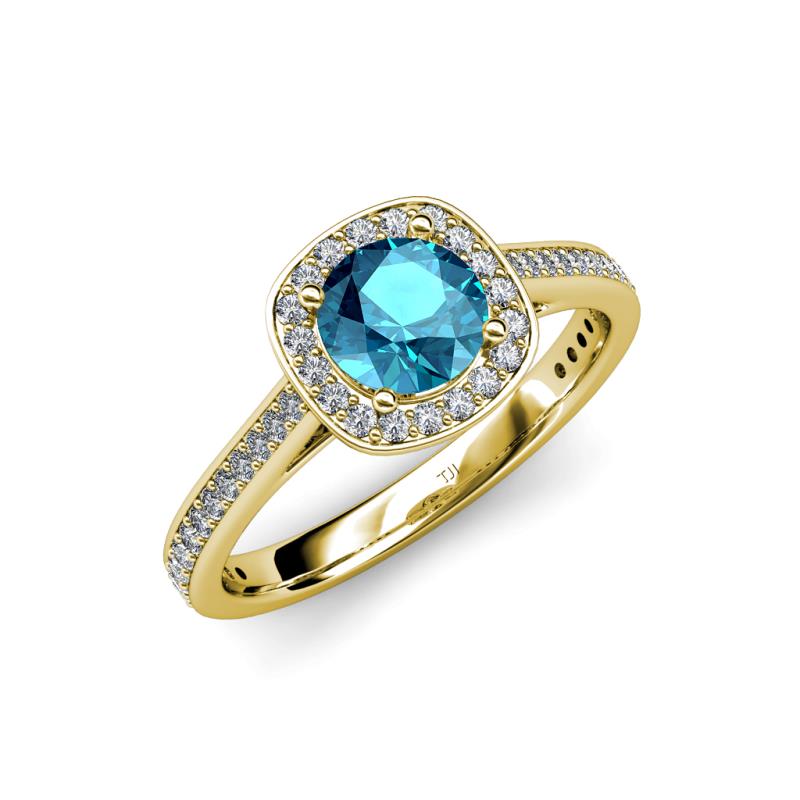 A Halo Cushion Frame of shimmering Round Diamonds surrounds the Center London Blue Topaz while additional Diamonds line the Ring's shank which gives a grace to the Ring making it a brilliant circle of Love.
