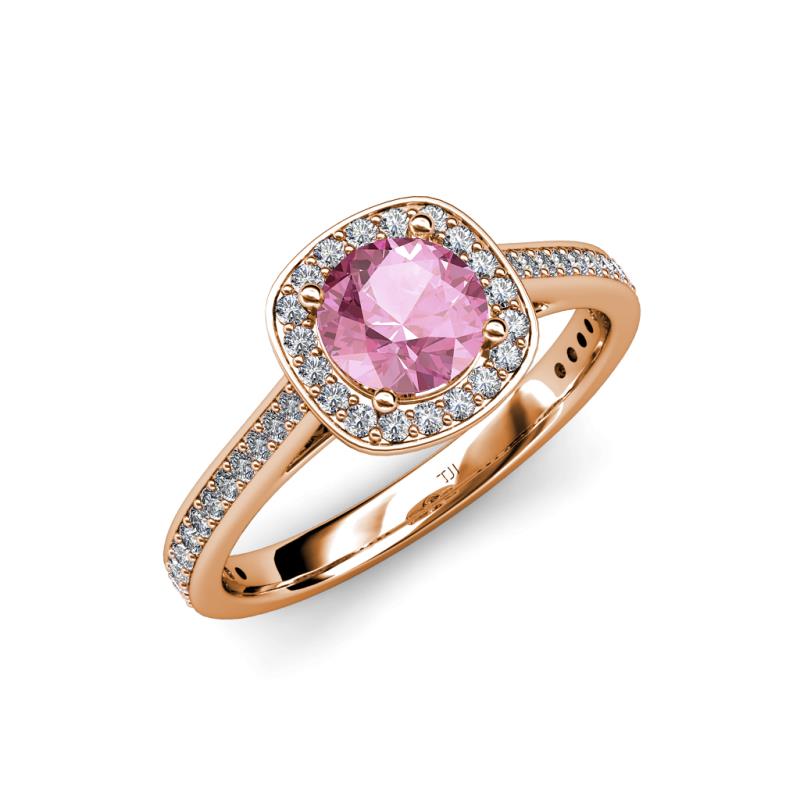 A Halo Cushion Frame of shimmering Round Diamonds surrounds the Center Pink Tourmaline while additional Diamonds line the Ring's shank which gives a grace to the Ring making it a brilliant circle of Love.
