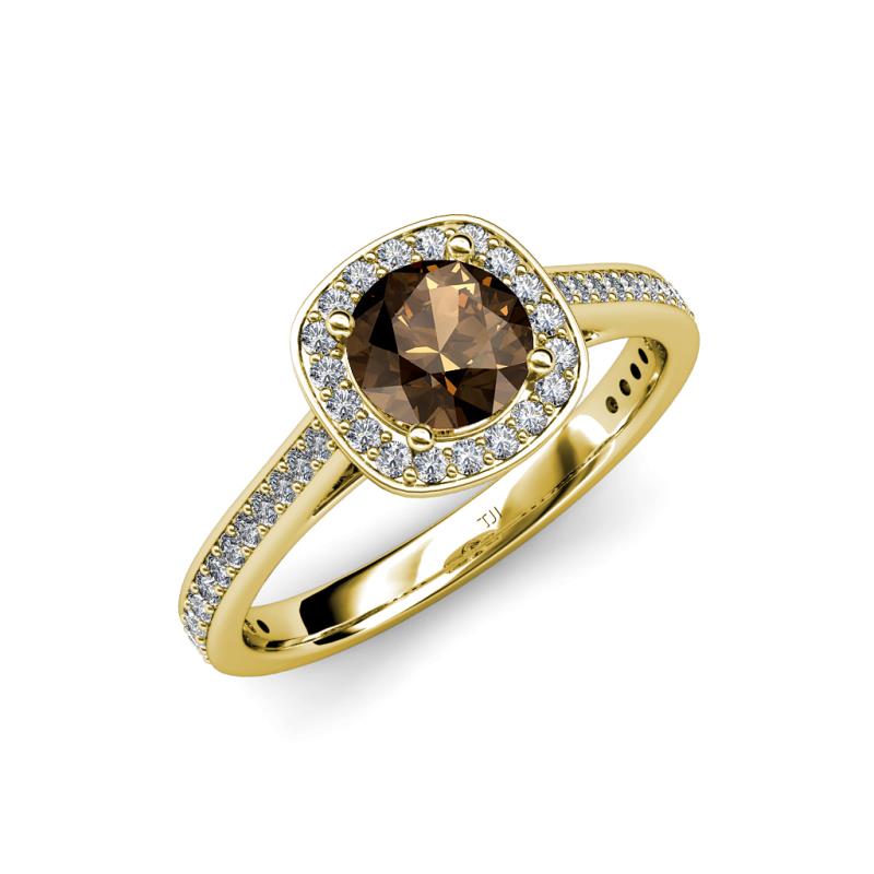 A Halo Cushion Frame of shimmering Round Diamonds surrounds the Center Smoky Quartz while additional Diamonds line the Ring's shank which gives a grace to the Ring making it a brilliant circle of Love.