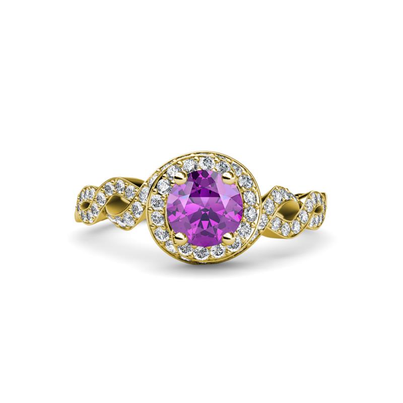 This vintage Ring showcases Amethyst embraced by corkscrew of Diamonds forming a cyclone which continue to form a double crossover pave shank with undergallery design making it an enduring statement of love.