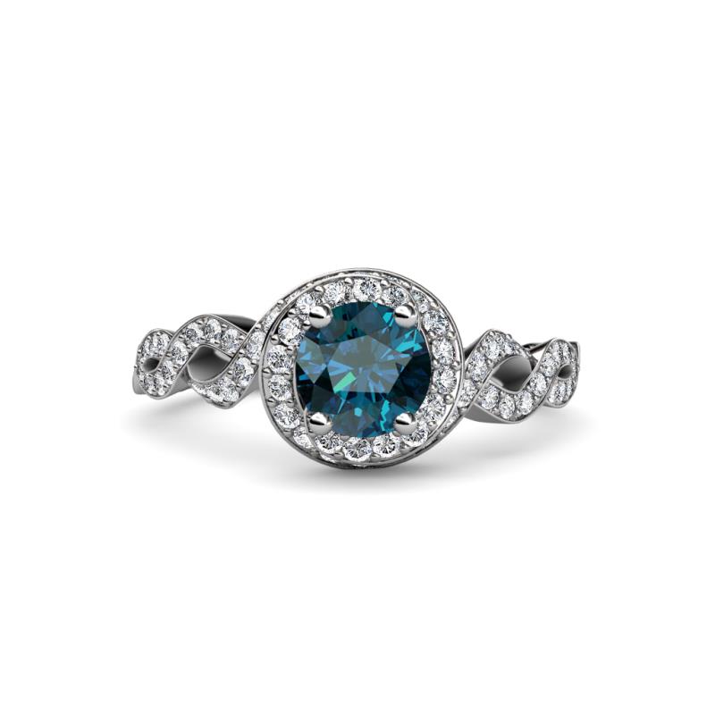 This vintage Ring showcases Blue Diamond embraced by corkscrew of White Diamonds forming a cyclone which continue to form a double crossover pave shank with undergallery design making it an enduring statement of love.