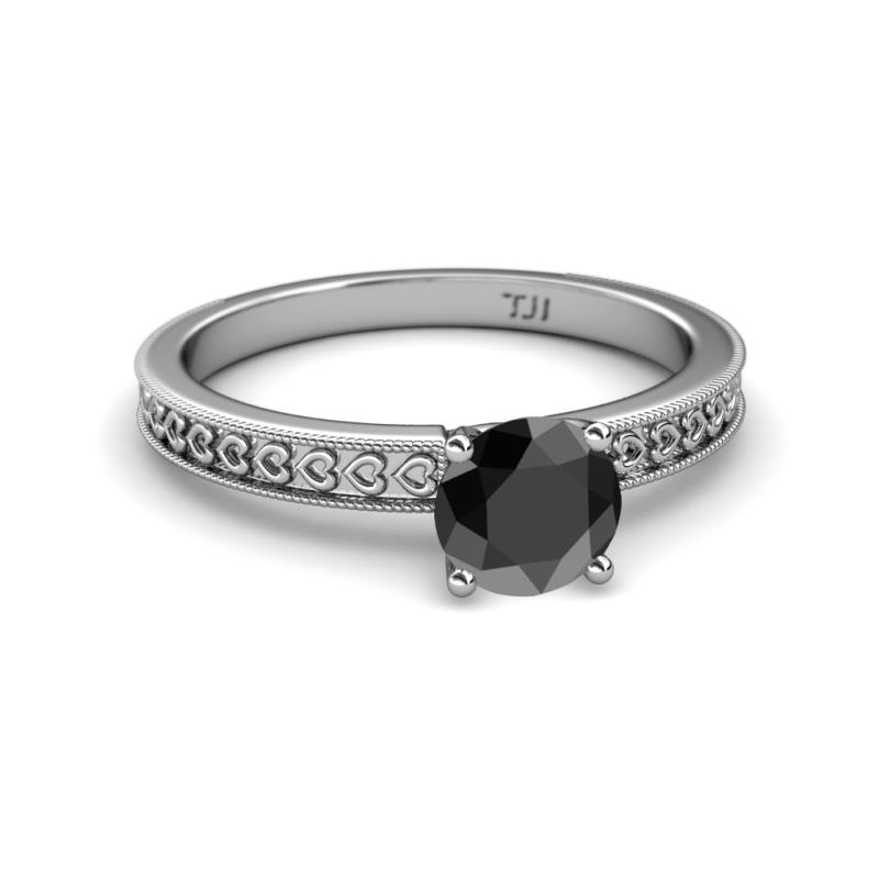 A perfect Ring to show your love and devotion, this Vintage inspired Black Diamond Solitaire Engagement Ring features motif of Engraved hearts all around the shank while a classy finishing touch is perfectly provided by milgrain edges.