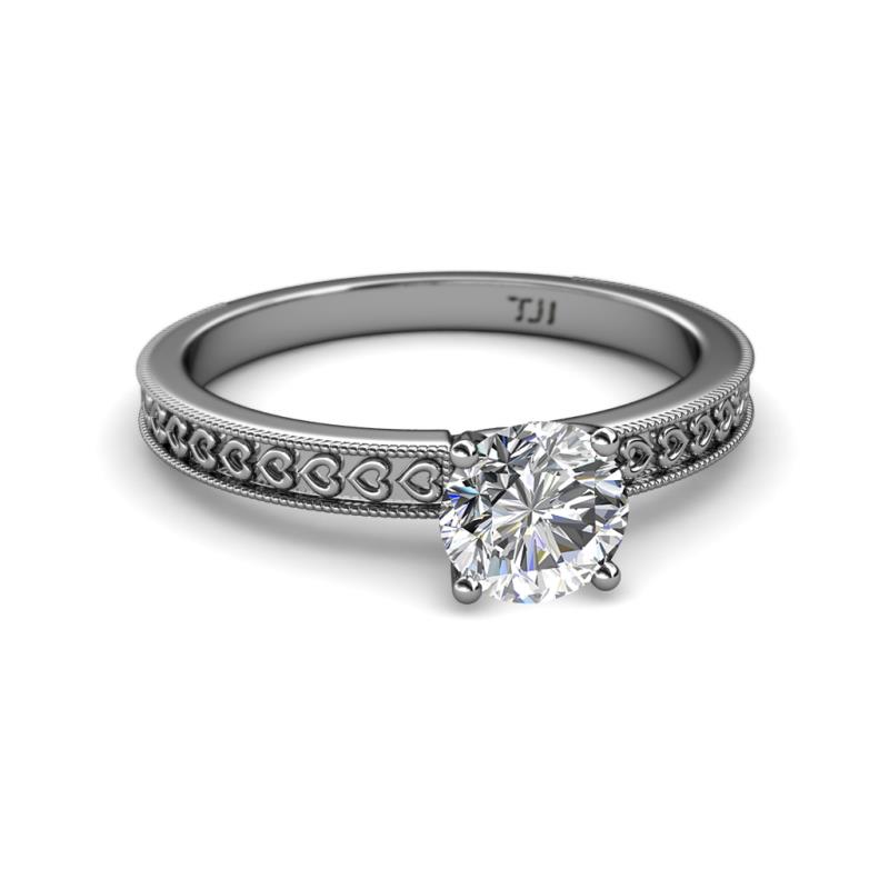 A perfect Ring of 1.00 ct to show your love and devotion, this Vintage inspired center IGI Certified Round Lab Grown Diamond Solitaire Engagement Ring features motif of Engraved hearts all around the shank while a classy finishing touch is perfectly provided by milgrain edges.
