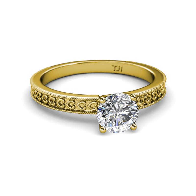 A perfect Ring of 1.00 ct to show your love and devotion, this Vintage inspired center IGI Certified Round Lab Grown Diamond Solitaire Engagement Ring features motif of Engraved hearts all around the shank while a classy finishing touch is perfectly provided by milgrain edges.